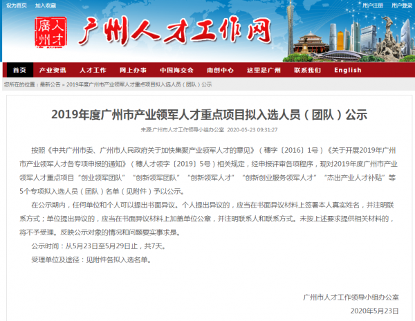 2019年度廣州市產(chǎn)業(yè)領(lǐng)軍人才重點項目擬入選人員(團隊)公示鏈接: