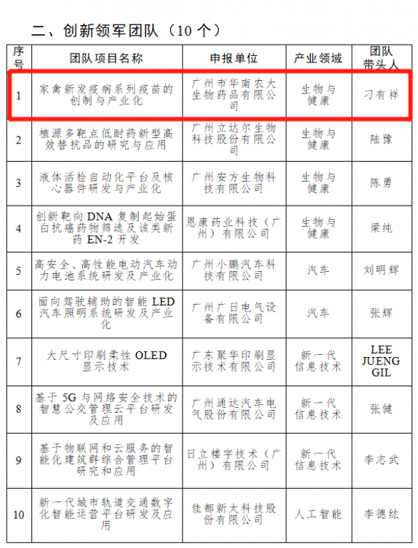 5月23日,2019年度廣州市產(chǎn)業(yè)領(lǐng)軍人才重點項目擬入選人員(團隊)公示,按照關(guān)于加快集聚產(chǎn)業(yè)領(lǐng)軍人才的意見相關(guān)規(guī)定,經(jīng)申報評審各項程序,廣州市華南農(nóng)大生物藥品有限公司擬入選“2019年度廣州市創(chuàng)新領(lǐng)軍團隊”。