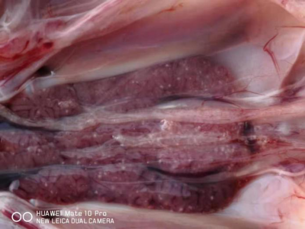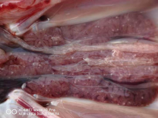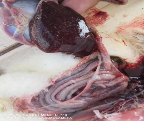 剖檢27天齡病死的小鵝,可見肝臟、脾臟、腎臟、腸道彌散針尖大白色壞死點。見下圖