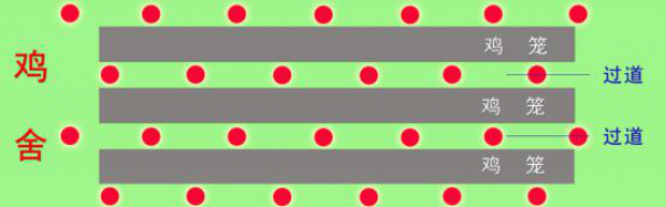 相鄰兩列照明燈應交叉排列,以補足處于兩燈之間的雞群光照強度的不足,如果是H型籠,同列照明燈也可以采用一高一低的方式吊裝。排列方式如下圖示意: