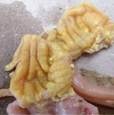 羽毛生長不良,口腔影響胃腸道機能,導致腸道出血以及黏膜水腫壞死潰瘍,神經失調,食欲下降、產蛋性能降低,免疫