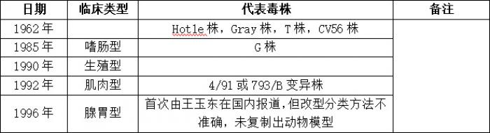 雞傳染性支氣管炎是一種廣泛存在的對家禽業造成巨大經濟影響的家禽疾病。不斷出現的新的IBV基因型及不同基因型之間缺少交叉保護已經成為防控IBV的重要挑戰。IBV致病型(臨床型)與IBV毒株血清型/基因型之間并無必然的聯系,不同血清型或基因型毒株可能屬于相同致病型。同時,屬于同一血清型或基因型的IBV毒株可能屬于不同致病型。現就雞傳染性支氣管炎病毒臨床分型和代表毒株說明如下: