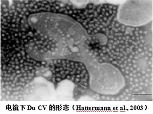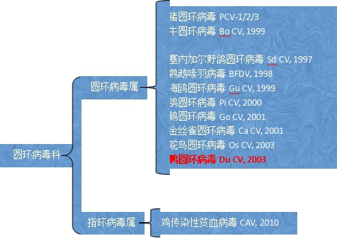 最早在2002年,德國科學家Hattermann 發(fā)現(xiàn)勃蘭登堡某養(yǎng)鴨場的法國番鴨表現(xiàn)出羽毛凌亂、生長遲緩、體重減輕等癥狀,認為這與其他禽類感染圓環(huán)病毒后的臨床特點很相似,于是對樣品進行負染電鏡(EM)檢測發(fā)現(xiàn),法氏囊中存在無囊膜的球狀病毒,直徑大約為 15~16nm。最終根據(jù)圓環(huán)病毒rep基因的鑒定,發(fā)現(xiàn)與其他圓環(huán)病毒同源性僅39%~60%,與鵝圓環(huán)病毒同源性最高,但也僅為82%。推斷新發(fā)現(xiàn)的可能為新的圓環(huán)病毒,鴨圓環(huán)病毒DuCV。
