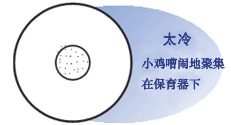 (3)雞舍內的溫度要保持均衡和穩(wěn)定,避免溫度忽高忽低和雞舍兩端溫差過大,檢查溫度是否合適的最佳方法,是觀察雞苗的分布狀態(tài)及活動表現(xiàn)(如下圖,中間小圓圈為加熱器)。